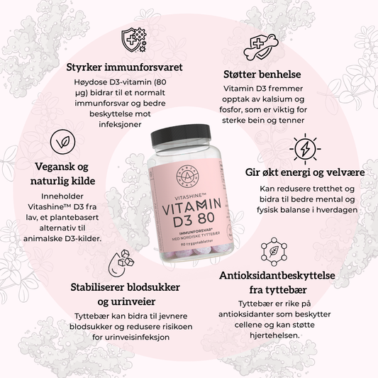 Vitamin D3 contributes to normal immune function, muscle function and energy, and is especially important when the sun is low. Magnesium supports the nervous system, contributes to better sleep and reduced fatigue. OptiMSM contributes to the body's natural energy production and general vitality.
